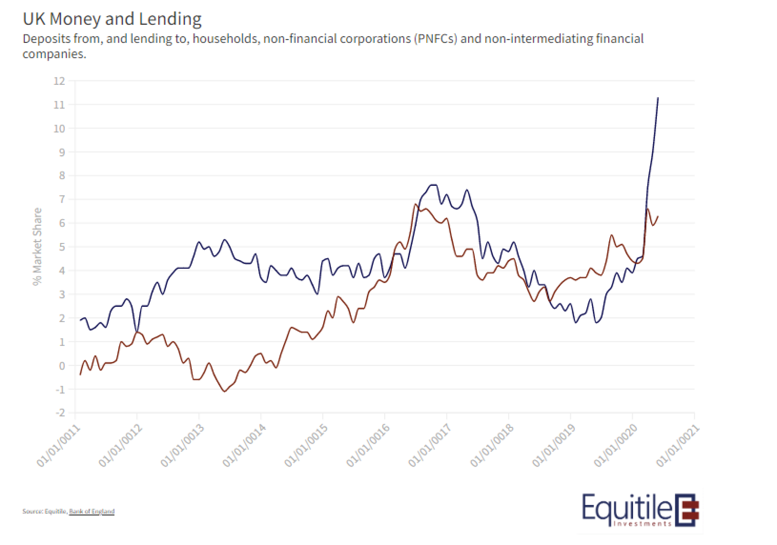 The Bank of England published data last week showing the sharp increase in retail bank deposits. There’s a startling build up of saving as those with an income spent more than 100 days, with the exception of Amazon and grocery stores, with no where to spend.