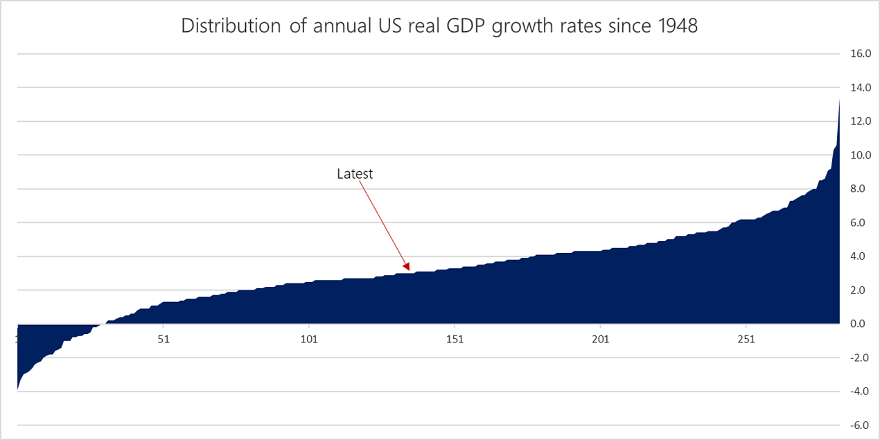 Our recent posting, Beware the Mean Reversionists, showed how the current US growth spurt is unremarkable in terms of its longevity or impact and, even if it was an outlier, the current growth rate itself is average by historic standards. Of all 283 twelve-month rolling growth rates since 1948, the current run-rate is about midway.