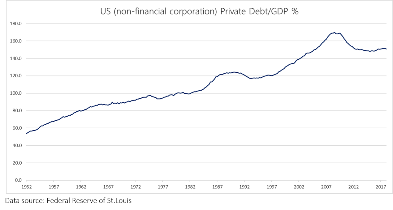 When we look at the headline numbers in this respect, we are reassured. The US private sector is not as indebted relative to GDP as it was before the Global Financial Crisis.