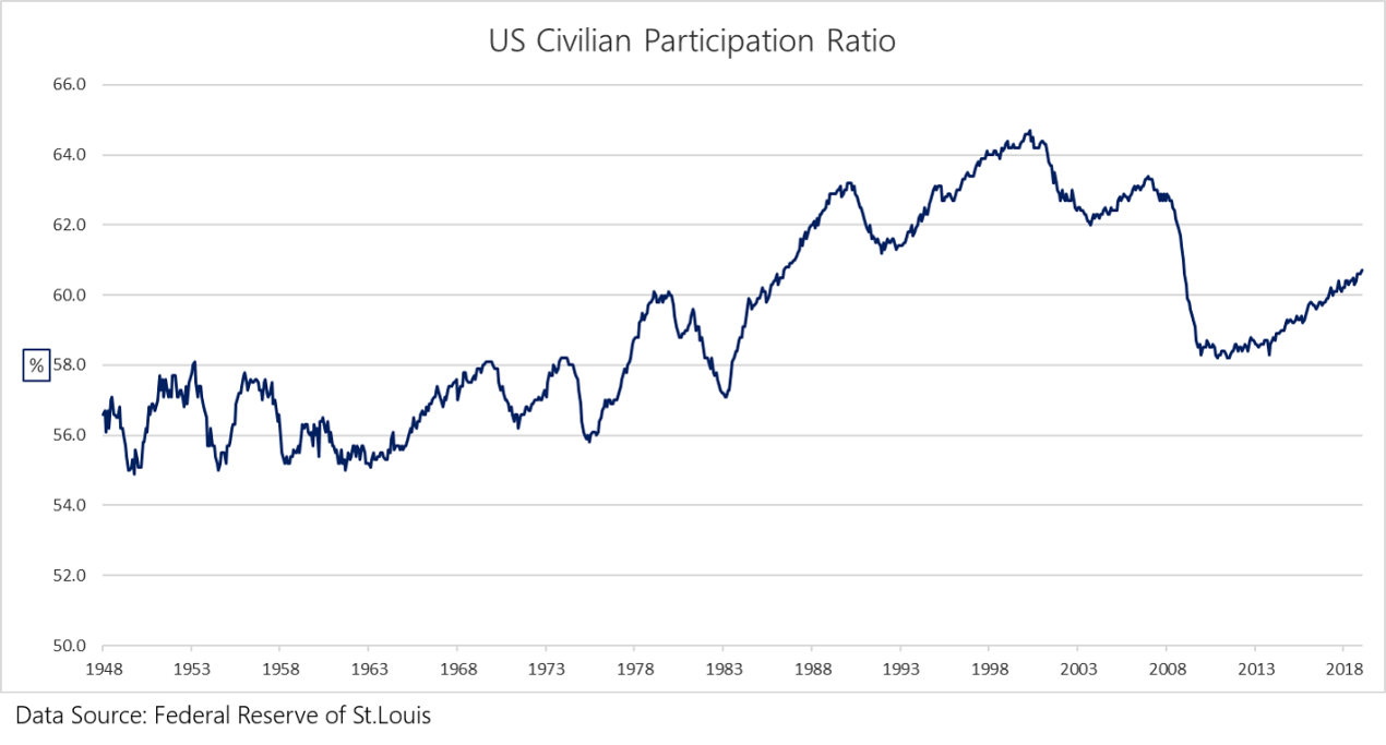 The recession after the financial crisis, for a myriad of reasons, kicked a high number of participants out of the jobs market – a fall too steep to be driven by demographics alone. It’s not unreasonable, therefore, to assume that the participation rate - the percentage of the civilian population that make themselves available for work - could pick up meaningfully from here.