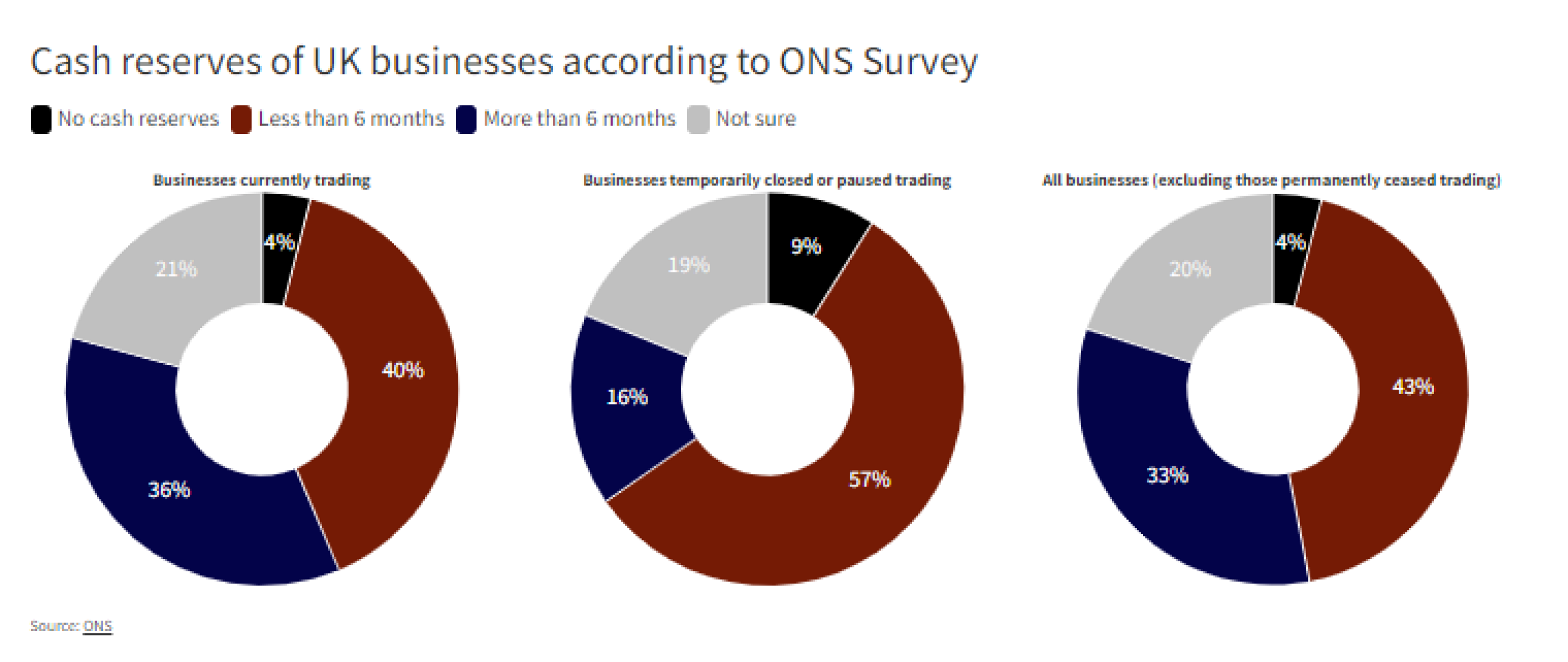 More worrying was companies’ assessment of their financial resilience. Of those businesses actually trading in mid-June, 44% said they have cash reserves to last less than six months. Including business that were still closed, close to half said they can’t survive more than six months given their current cash reserves.