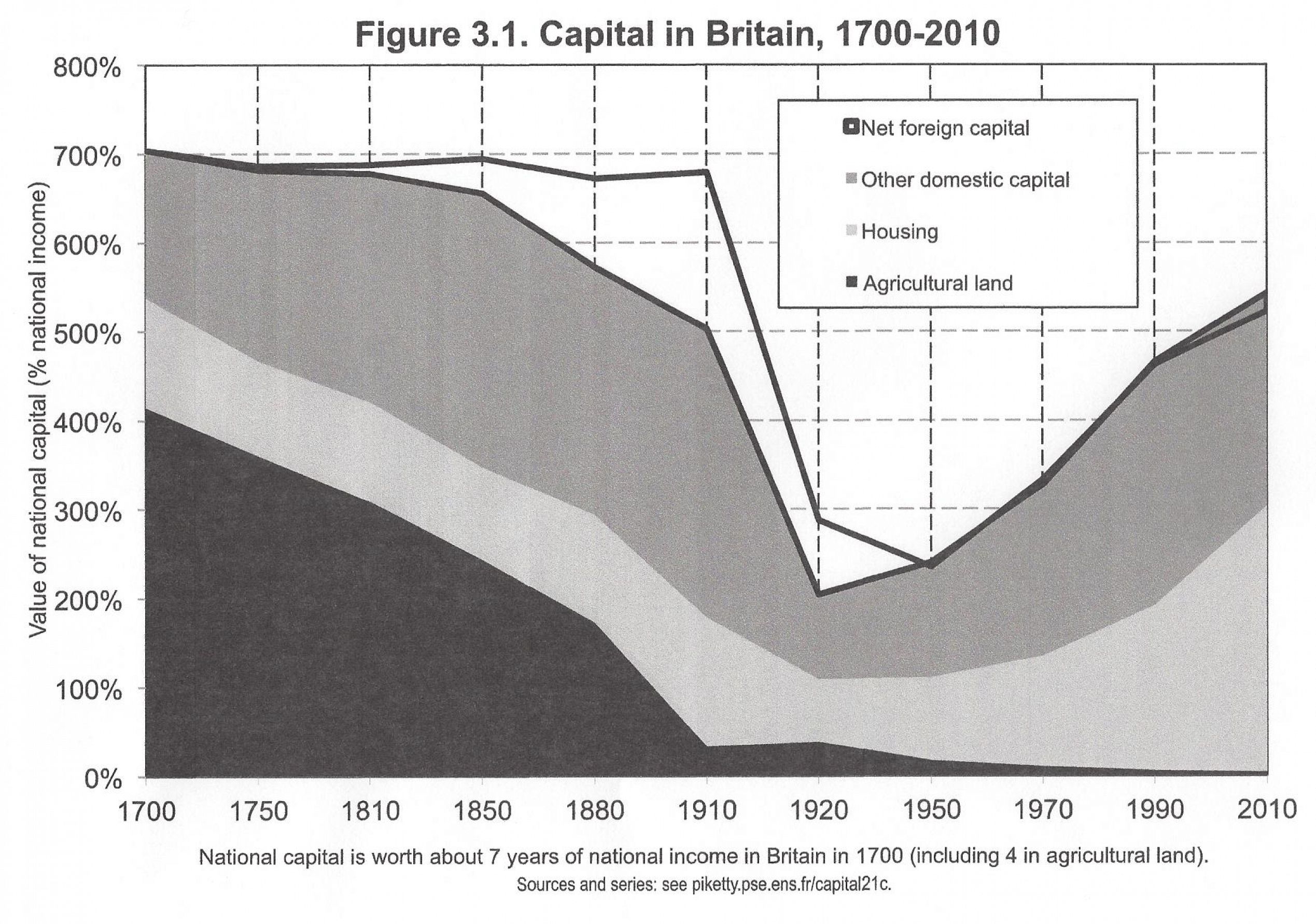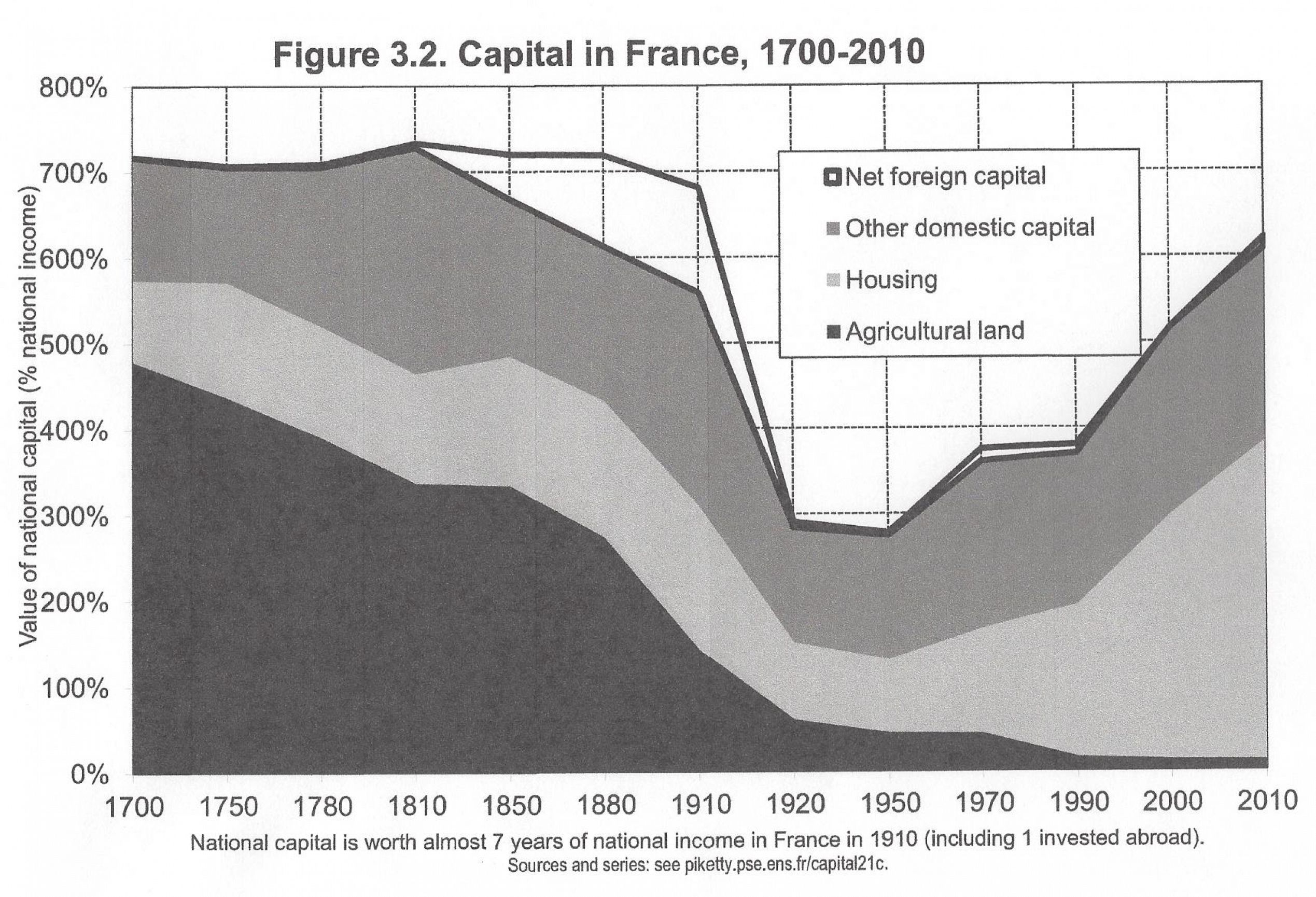 The charts of the composition of capital in Britain and France are especially informative. These show that the movements in the value of capital, from 1700 to the present day, have been dominated by two processes. The first was the near total destruction of the value of European agricultural land, the dominant form of capital in 1700. The second is the more recent rise in the value of housing over the last three or four decades.