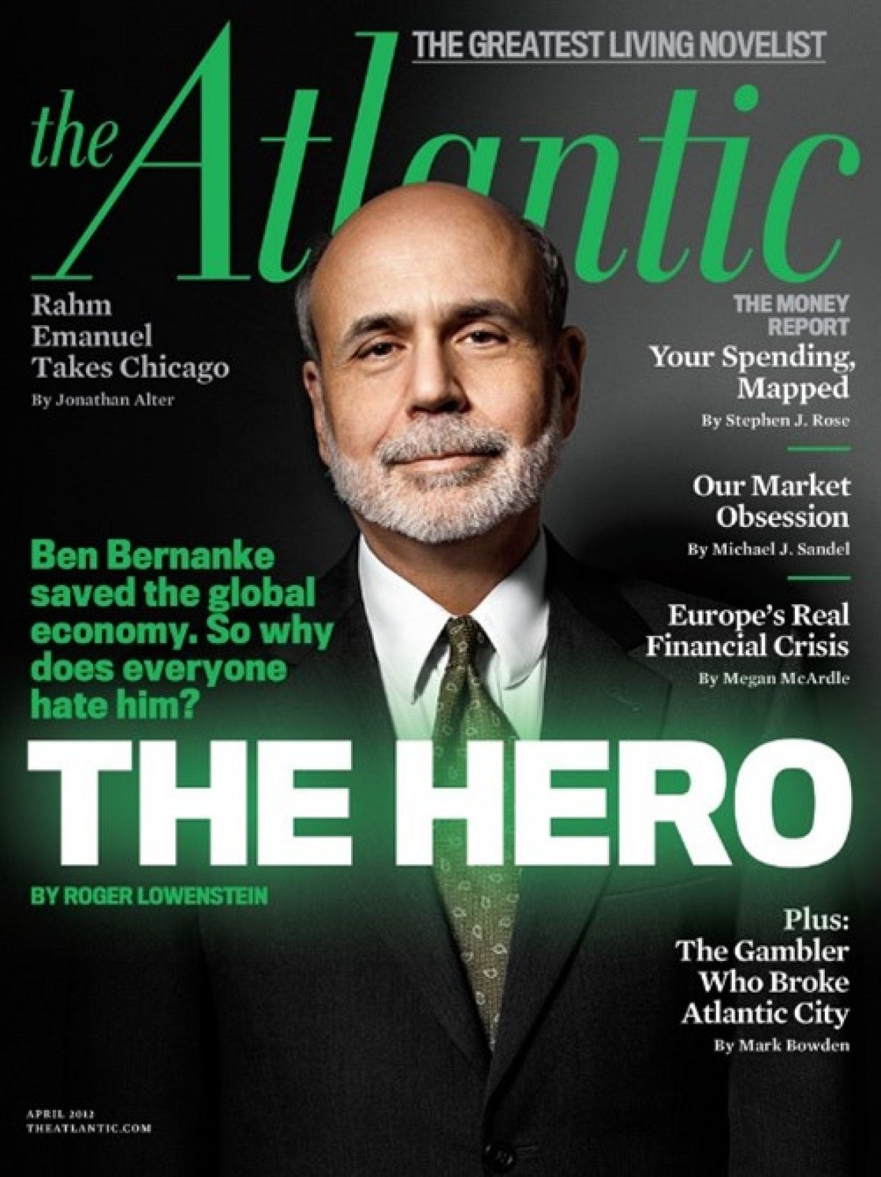 The end of Greenspan’s tenure as Fed Chairman was followed almost immediately by the Global Financial Crisis of 2007-2009. Initially this led to some introspection over both the validity of economic theory and the success of the Fed’s approach to monetary policy. In a 2008 testimony to Congress Greenspan talked of having discovered a ‘flaw in the system’ while in 2009 Paul Krugman asked ‘How Did Economists Get It So Wrong?’ To many, it appeared the Fed’s policies had encouraged the excessive leverage which caused the crisis. However, as the crisis evolved the Fed worked, together with the Treasury, to enact even stronger monetary policy interventions, most notably the Troubled Asset Relief Program or TARP, to counteract the worst effects of the crisis. These interventions were seen as triumphs for successfully resolving the crisis. As a result, the community of central bankers emerged from the crisis not chastened by having caused it but instead emboldened by their successes in fixing it. The 2012 cover of The Atlantic, featuring then Fed Chairman Ben Bernanke, captured the prevailing mood well.