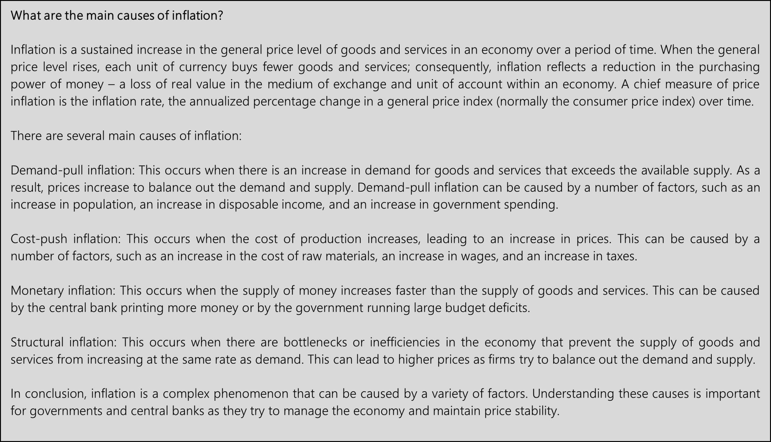 Although many of these technical problems will be ironed out with later releases, the ChatGPT phenomenon is also raising concerns at a grander level. High school students, for example, are already submitting essays written on the platform and so educationalists are worried, understandably, about the impact this might have on writing and critical thinking skills. Imagine an economics student, for example, being asked to write an essay outlining the main causes of inflation (see below) – it wouldn’t be awarded a Grade A by any means, but it breaks the back of the challenge and offers a good structure that the student could in-fill with a few examples.